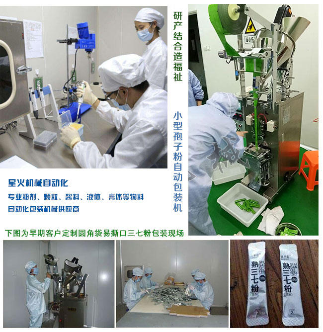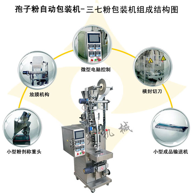 本孢子粉自動包裝機主要配件有:粉劑稱重頭、放膜結(jié)構(gòu)、微型電腦控制系統(tǒng)、橫封切刀、背封系統(tǒng)、小型成品輸送系統(tǒng)等組成,可根據(jù)需求配備自動螺桿上料系統(tǒng),實現(xiàn)靈芝孢子粉的自動上料、自動包裝、計量、打碼等工序。