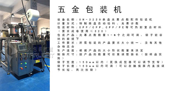 4、自動(dòng)化五金件包裝機(jī)能自動(dòng)完成震動(dòng)盤排列、計(jì)數(shù)、制袋、下料、封合、切斷、排氣、打印日期以及貼標(biāo)等等多種工作。