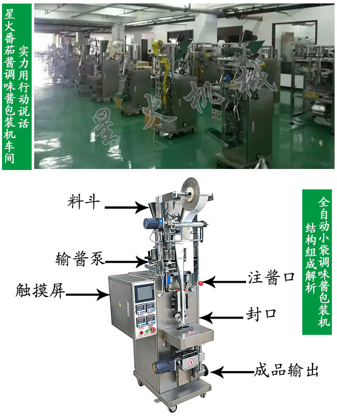 番茄醬調(diào)味醬包裝機是由星火公司在小袋立式包裝機的基礎(chǔ)之上研究開發(fā)的一款新型全自動包裝機,適用于番茄醬、芝麻醬、膏湯、方便面調(diào)料、調(diào)味醬等醬料產(chǎn)品的包裝生產(chǎn)。全自動小袋調(diào)味醬包裝機可實現(xiàn)背封、三邊封、四邊封等多種封袋方式,適合多種客戶需求。