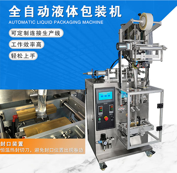 4、涼皮調(diào)料水包裝機橫封裝置橫封封輥上裝有不銹鋼面板,防止接觸橫封封棍而導(dǎo)致燙傷,涼皮調(diào)料水包裝機采用三邊封封口方式。