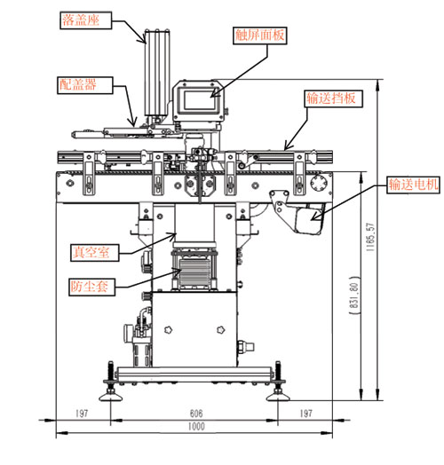 完成灌裝工序沒(méi)有加蓋子的瓶子從機(jī)器的進(jìn)出罐輸送左側(cè)進(jìn)入,在輸送器的兩側(cè)擋板上裝有氣動(dòng)的擋罐裝置,擋罐器的作用是確保每次只有一個(gè)瓶子進(jìn)入推送位置,并且在在抽真空旋蓋過(guò)程中其它瓶子不會(huì)誤入。